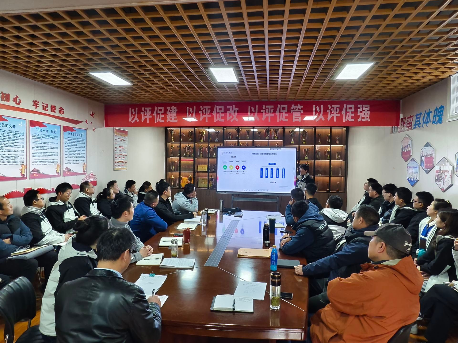 在会议室召开本科教育教学审核评估入校考察动员大会。院长熊玲主持会议,学院领导班子及全体教职工参会。